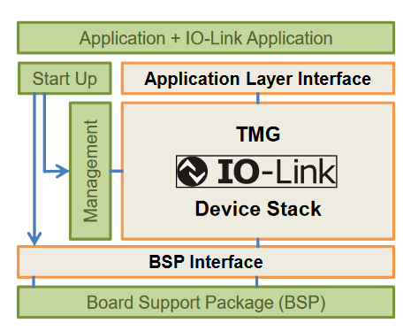 Um ein IO-Link Device zu implementieren bietet TMG den IO-Link Device Stack, die IO-Link Device Stack Extensions und IO-Link Device Firmware Update an. Der Device Stack realisiert die IO-Link Kommunikation bis zum Application Layer Interface. Die IO-Link Device Stack Extensions übernehmen die IO-Link Applikationsfunktionen wie den Gerätetausch ohne Tool. Das IO-Link Device Firmware Update wird dann benötigt, wenn die Firmware des IO-Link Devices mit einem standardisierten Mechanismus aktualisiert werden soll.