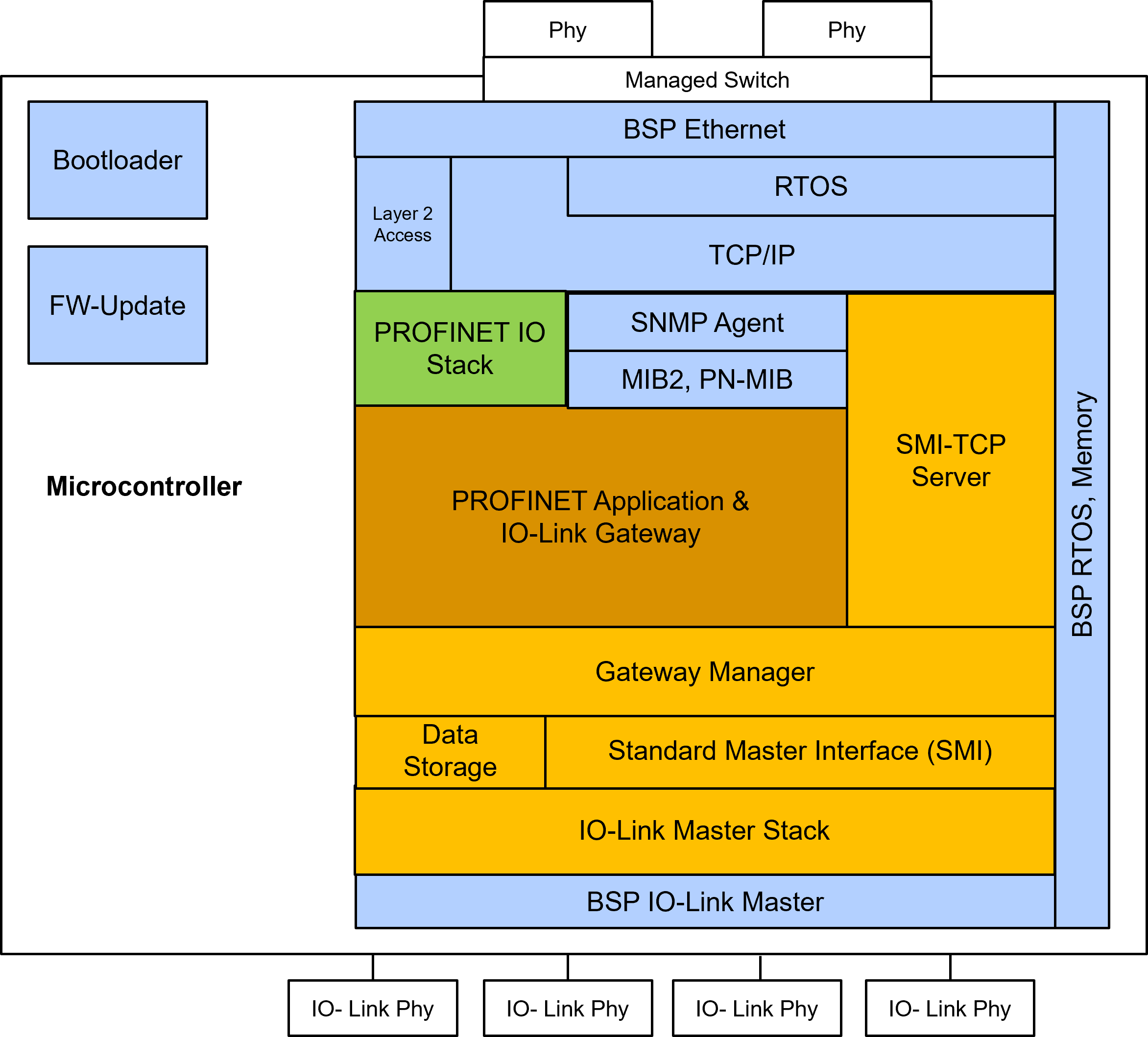 Unsere IO-Link Master Software hat den weltweit größten Verbreitungsgrad und ist für die unterschiedlichsten Architekturen einsetzbar. Neben der portierbaren universellen Lösung bieten wir unsere In-Design-Solution an. Hier wird der IO-Link Master auf einem separaten Mikrocontroller realisiert, der über eine serielle Schnittstelle mit einem Host-Controller kommuniziert. Die Lösung kommt mit Schaltplan, gebrauchsfertiger Firmware, Host-Treiber-Source-Code sowie Testreport. Diese Lösung ermöglicht Ihnen die kürzeste Markteinführungszeit.