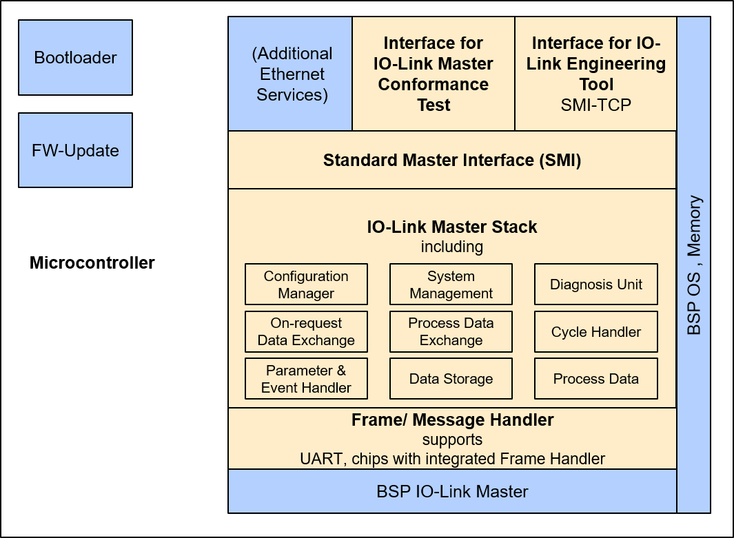 Wir bieten zum einen unsere IO-Link Master Software V3 an. Diese besteht aus dem Kommunikations-Stack, Frame/Message Handler, Standard Master Interface (SMI) sowie einem Interface zur Anbindung des IO-Link Master Conformance Test und zur Anbindung eines IO-Link Engineering Tools.